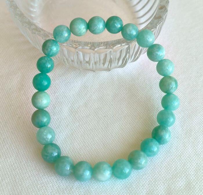 Herrenarmband 8 mm grosse Kugeln aus Amazonit. Auf Elastik aufgezogen, also sehr bequem an- und auszuziehen.