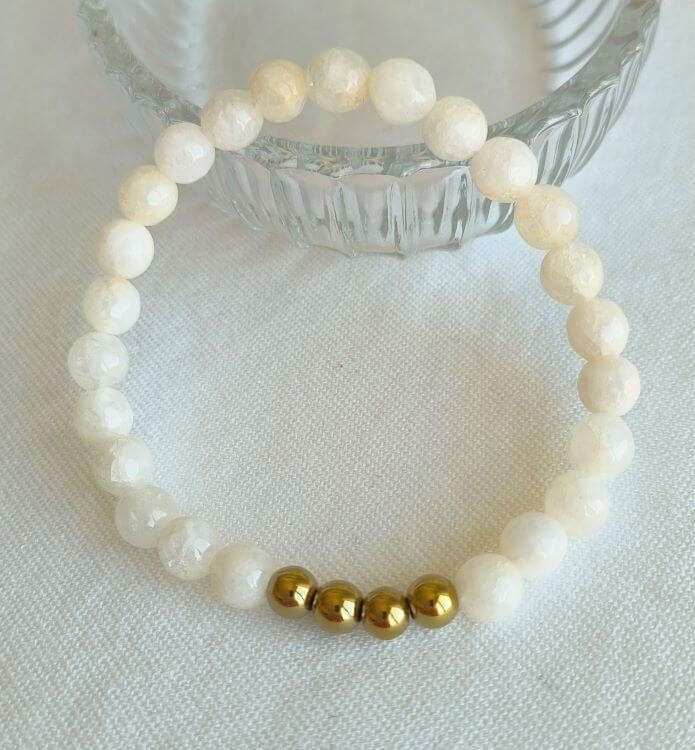 Herrenarmband 8 mm grosse helle Jade-Kugeln. Vier goldfarbene Hematin-Kugeln als Mittelstück. Auf Elastik aufgezogen, also sehr bequem an- und auszuziehen.