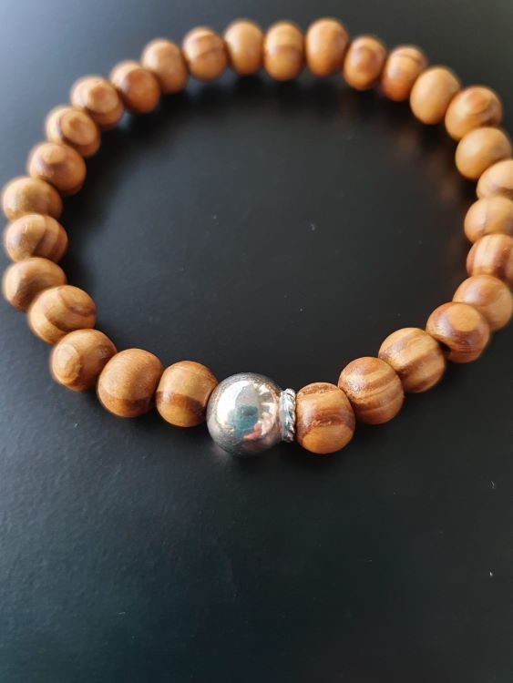 Herrenarmband 8 mm grosse Kiefernholz-Kugeln mit einer Fokus-Perle aus 925 Sterling Silber. Auf Elastik aufgezogen, also sehr bequem an- und auszuziehen.