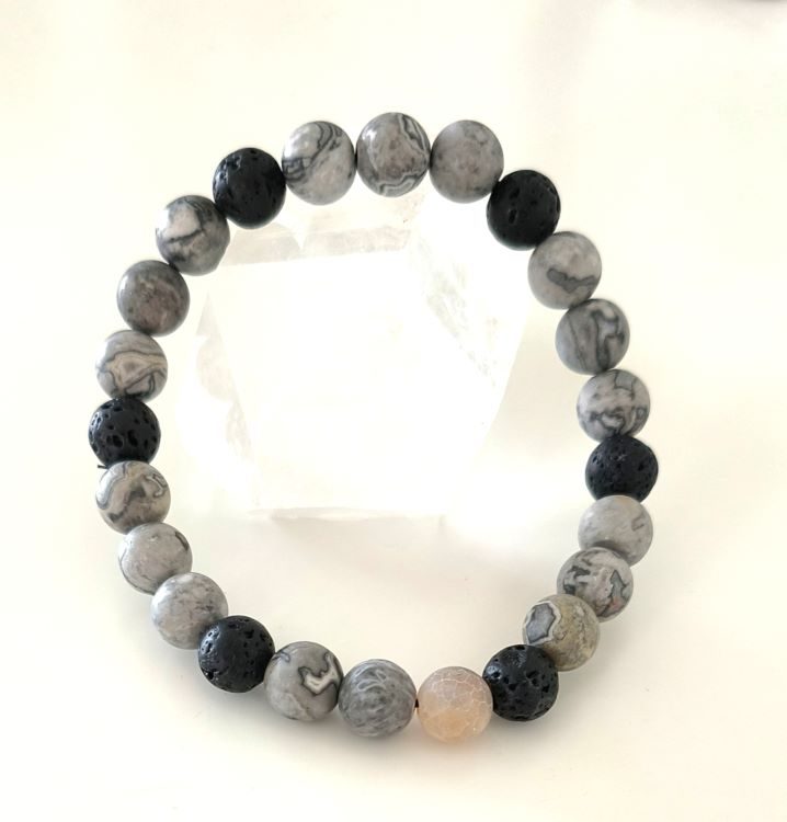 Herrenarmband 8 mm grosse Picasso-Marmor- und Lava-Kugeln. Auf Elastik aufgezogen, also sehr bequem an- und auszuziehen.